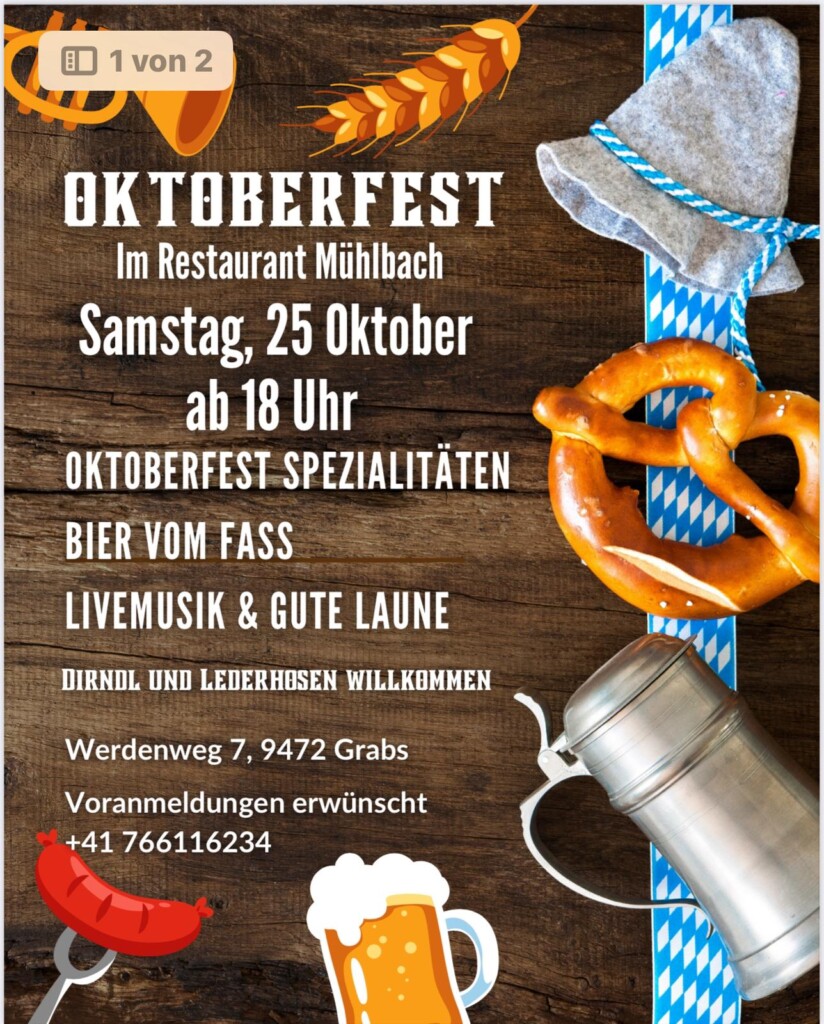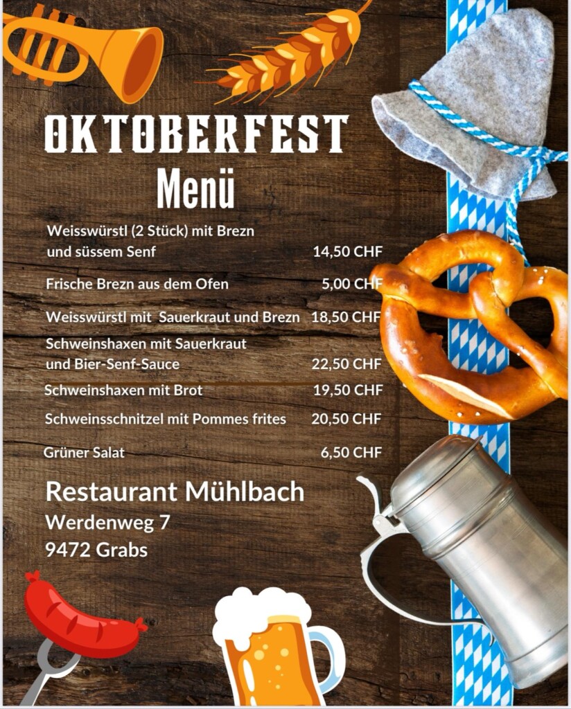 Eine Voranmeldung ist unter der Telefonnummer +41 766 116 234 erwünscht. Außerdem sind Dirndl und Lederhosen herzlich willkommen, um die Oktoberfest-Stimmung perfekt zu machen.